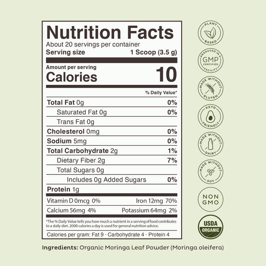 Organic Moringa Powder - Vegan Superfood Booster, Gluten Free, Non GMO - 2.5 Oz, 20 Servings